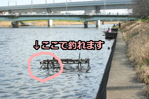 陸から4メートルくらいのところに杭がいくつも打ち込まれているので、その近辺や画像のようにヘラ師の拠点の支柱周りがポイントになります。エサはミミズです。